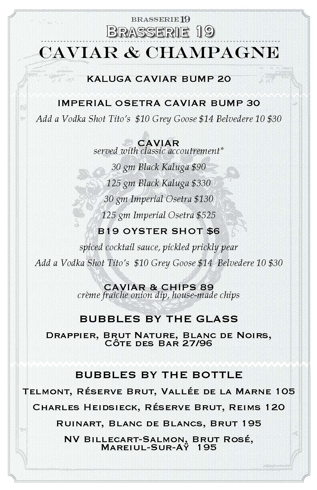An indulgent pairing of bubbles and luxury, designed the Brasserie 19 way. Enjoy a curated selection of champagnes alongside premium caviar service.
