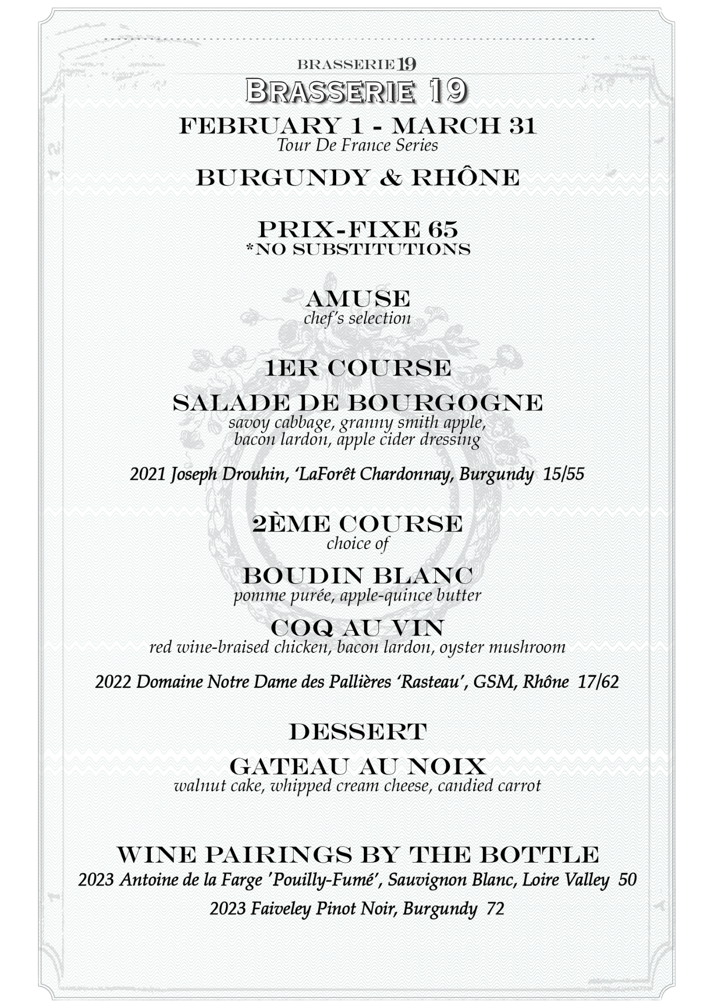 Please note: Due to varying availability and vintages, our wine list changes frequently and can be viewed in the restaurant.